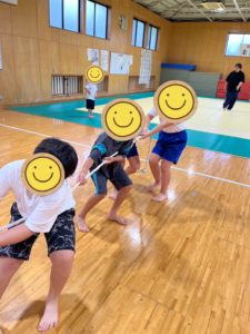 今月は坂出市にある武道館をお借りすることが出来ました!今年は暑いので熱中症警戒アラートが発令する日が多く、子どもらは体力を持て余してしまう日々があったので、折角の夏休みをそのままで終わらしてしまうのは勿体ないなと悩んでいました。暑い中でも動けて尚且つ熱中症のリスクが減る場所はどこかな?と各事業所職員でリサーチしました。武道館には、全事業所合同で参加し音楽療法を取り入れ、全体を通しての活動もプロジェクトに盛り込みました。音楽療法では、リズムや音楽にのり心地よくリラックスしながら楽しめました♪♪自然と笑顔が溢れる子が多かったです。そして、休憩を挟んでからは全力で動ける遊びとして、レクリエーションも企画して存分に動いて笑って楽しめました!