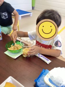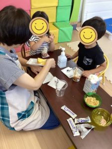 今月はクッキングでフルーツパフェを作りました。今、旬な飯山の桃を贅沢にふんだんに使いました🍑最初に作り方を全体に説明し、各グループに分かれ、カップの中にどういう順番で何を入れるかを決め、作り出しました。小さい子は中々決められない場面もありましたが、それでもお兄ちゃんやお姉ちゃんの作っている姿を見て、必死に真似をしていました!分からない所は自分から職員に聞いてくれていました。皆で同じ物を作っても、1人として同じ盛り付けにならないのが不思議でした☺️💭 出来上がったパフェをお友達に見せ合い、またそれで話が盛り上がっていて楽しいひと時を過ごせました📸