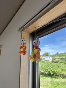 製作では、アールさんでみのむしを作りました。秋の虫と言えば、思い浮かぶのはみのむしです🍁みのむしの型は職員で用意し、こどもは型にそってハサミで切りました!模様については色んな材料から選んで貰い、自分だけのみのむしの完成です🐛 どんな色やデザインを選ぶかで全然見え方も変わり、優しそうなものから強そうな物まであったり、子ども達のアイデンティティが込められていました(^^♪