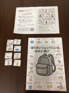 今月のアンの防災のお話は「防災グッズ」をテーマにしました⛑️何はともあれ、防災グッズに先ず興味を持って欲しくビンゴ形式で行いました。未就学児なので、一人では難しいのでグループ分けをして、用紙を見ながら、これらはどこにあるのかな~と質問し、グループごとに部屋に散りばめて置いていた物を探し始めました。一つ見つかるごとに嬉しそうに職員に見せてくれました👀その後、グループごとで「皆なら防災リュックに何を入れる?」と言うことでしました🎒色んなグッズがあったので、全部入れるのかなと思っていたら、そんなことはなくお友達とお話をして決めることが出来ました!完成した物をグループで見て、防災グッズそれぞれに「こんなことも出来るんだよ!こう言う使うやり方もあるんだよ!」と説明すると、そんな使い方があるのか~と言った表情で最後まで興味を持って聞いてくれました🦻また、グループごとで全然リュックに入れる物も違うくて、子ども達は面白そうにしていました😂