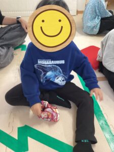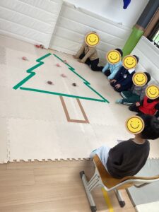アールのクリスマス会では、紙相撲大会を盛大にしました🌟それからクリスマスに因んだクリスマスクイズをしました⭕❌ プレゼントを千本引きのようにして開催し、引いた糸を辿ると運命のクリスマスプレゼントを引き当てられます🎉子ども達はもちろん大喜びです🤩事前にリース作りもしました。子どもによって色合いもそれぞれで、彩り豊かな物が完成しました👏