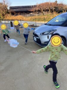 三が日は過ぎましたが、まだまだお正月気分は続きます🥡正月なので凧あげと絵馬作りもしました🎨凧あげはビニール袋を使い、その袋に子どもたちに好きに描いて貰い、自分だけのカラーリングをしました!その後も装飾として、シールを貼ったり、尾っぽの部分にテープを付けたりして施しました🐙お友達と見せ合い、「ここはこの色にしたん?俺のは~やで!」と言ってにこやかに話をしていました。完成すると、いざ実践で外に行きました。風を読んでするなど、難しいことは抜きにして、思うがままに駆け出しました🍃難しい子には、お手本を見せたり、一緒に考えたりしました。中には手が下のままだったので、空中で舞わない状態の子も居て、「手は取り敢えず上にしてみよっ!」と声掛けをすると、少しずつ飛んでいる時間が延びました🎈 絵馬作りは、今年は午年なので主役は午です🐎馬の形が切り抜かれた物を職員が用意して、子どもたちはその空白の部分に好きなスタンプを選んで、ポンポンと押してもらいました🟩🟫次に、余った余白の部分にも押してもらい、絵馬の紙に願い事を書きました♫写真のように皆それぞれ、思い思いに書き記しました📝それ以外にも、貼り絵で大きな物も作りました。アールに飾っていますので、また来られた際には是非見に来てください🪟